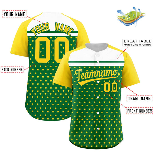 Custom Gold Kelly Green-White Raglan Sleeve Personalized Star Print Authentic Baseball Jersey Limited